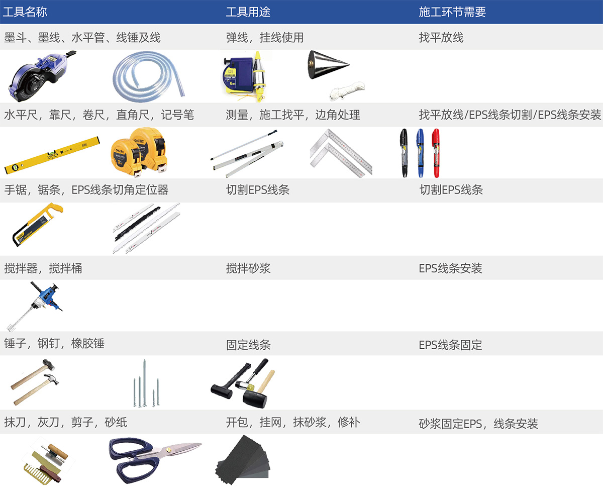 根据项目要求购买适合的EPS构建:罗马柱,门套,窗套,檐线,腰线,山花,廊柱,浮雕等。根据不同种类,编号,规格,尺寸,型号进行分类摆放,方便施工人员安装时使用。购买EPS线条专用粘胶剂。施工工具准备。